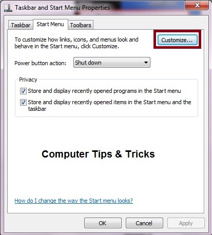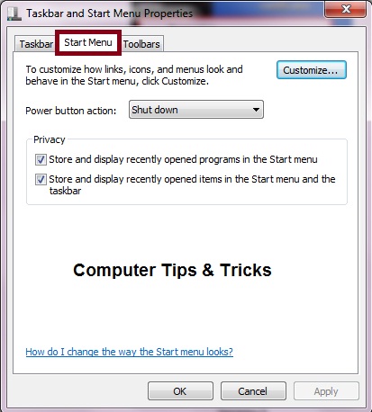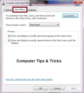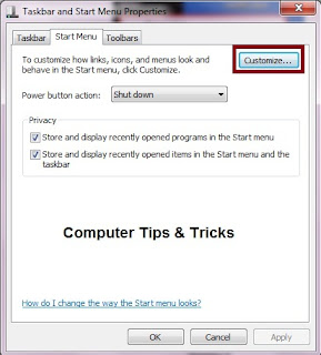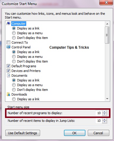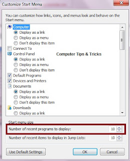 अब जो विंडो खुलेगा उसमे सबसे निचे "start menu size" सेक्शन में "number of recent programs to display" के सामने लिखे नंबर को अपने अनुसार सेट कर दीजिये |यानि आप जितने प्रोग्राम को स्टार्ट मेनू में दिखाना चाहते है वो संख्या वह सेट कर दीजिये |